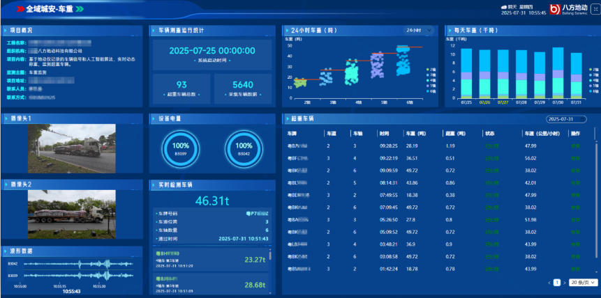 • 交通数字化感知 - 通过少量视频设备与沿线振动传感器的协同工作,实现车辆运行全过程的数字化记录,可获取车辆轨迹、通行时间、速度、车辆重量、车轴数等关键数据。